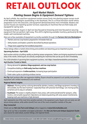 As April unfolds, the used farm equipment market moves firmly into planting season across much of the Midwest and begins accelerating in the Southeast. This is a critical transition month where preparation turns into execution, and equipment demand becomes more immediate. Dealers and auction houses are reporting quicker turnover, especially on machines that are field-ready and equipped for spring work.