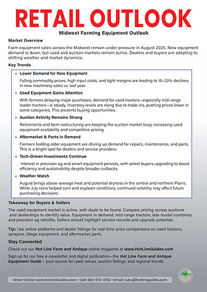 Farm equipment sales across the Midwest remain under pressure in August 2025. New equipment demand is down, but used and auction markets remain active. Dealers and buyers are adapting to shifting weather and market dynamics.