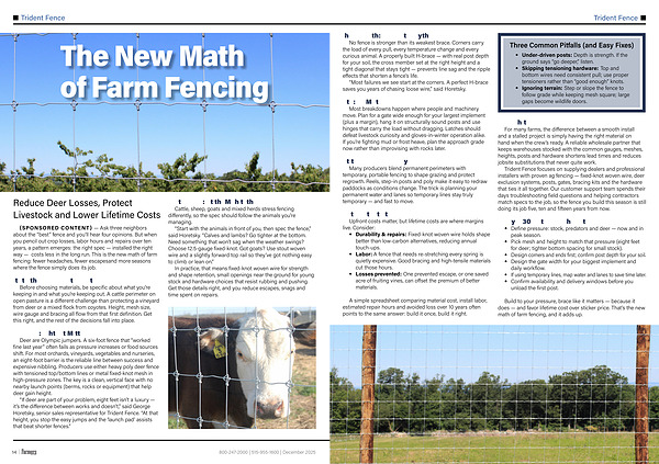 ( SPONSORED CONTENT)— Ask three neighbors about the“ best” fence and you’ ll hear four opinions. But when you pencil out crop losses, labor hours and repairs over ten years, a pattern emerges: the right spec— installed the right way— costs less in the long run. This is the new math of farm fencing: fewer headaches, fewer escapesand more seasons where the fence simply does its job.
