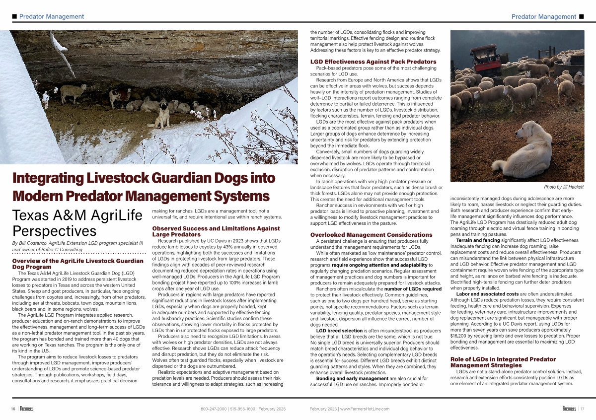 The Texas A & M AgriLife Livestock Guardian Dog( LGD) Program was started in 2019 to address persistent livestock losses to predators in Texas and across the western United States. Sheep and goat producers, in particular, face ongoing challenges from coyotes and, increasingly, from other predators, including aerial threats, bobcats, town dogs, mountain lions, black bears and, in some regions, wolves.