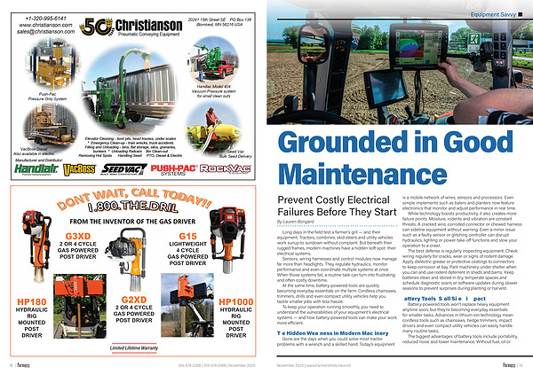 The best defense is regularly inspecting equipment. Check wiring regularly for cracks, wear or signs of rodent damage. Apply dielectric grease or protective coatings to connectors to keep corrosion at bay. Park machinery under shelter when you can and use rodent deterrent in sheds and barns. Keep batteries clean and stored in dry, temperate spaces and schedule diagnostic scans or software updates during slower seasons to prevent surprises during planting or harvest.