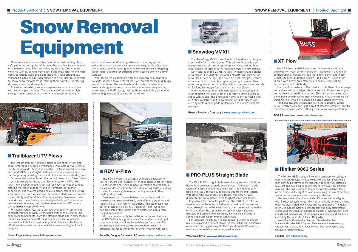 Snow removal equipment is essential for maintaining clear, safe pathways during the winter months, whether for residential or commercial use. Midsized vehicles, such as utility terrain vehicles( UTVs), benefit from specialized plow attachments that come in various sizes and blade designs. These straight and V-shaped blades ensure even plowing and are ideal for moderate to heavy snow removal tasks, making them suitable for clearing driveways, trails and worksites.