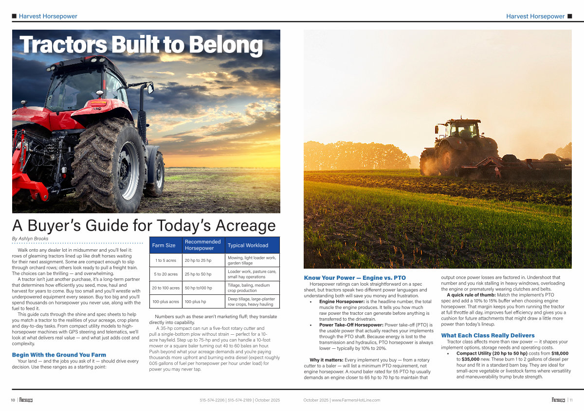A quick rule of thumb: Match the implement’ s PTO spec and add a 10 % to 15 % buffer when choosing engine horsepower. That margin keeps you from running the tractor at full throttle all day, improves fuel efficiency and gives you a cushion for future attachments that might draw a little more power than today’ s lineup.
