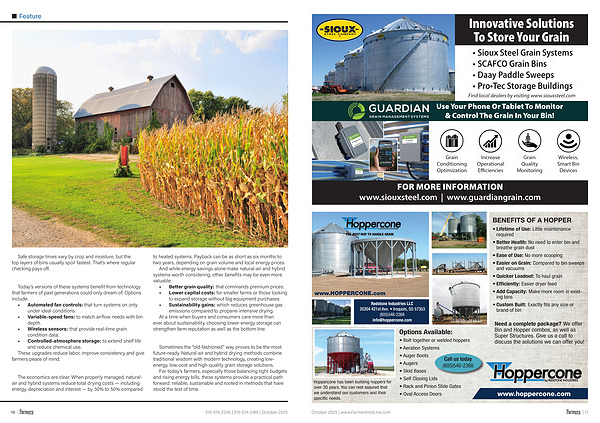 The economics are clear. When properly managed, naturalair and hybrid systems reduce total drying costs— including energy, depreciation and interest— by 30 % to 50 % compared to heated systems. Payback can be as short as six months to two years, depending on grain volume and local energy prices.