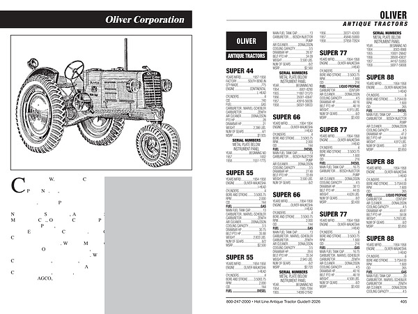 YEARS MFRD................. 1954-1958 ENGINE............. OLIVER-WAUKESHA.......................................... I-HEAD CYLINDERS................................... 4 BORE AND STROKE......... 3.50X3.75 RPM...................................... 2,000 CID.......................................... 144 FUEL................................. DIESEL