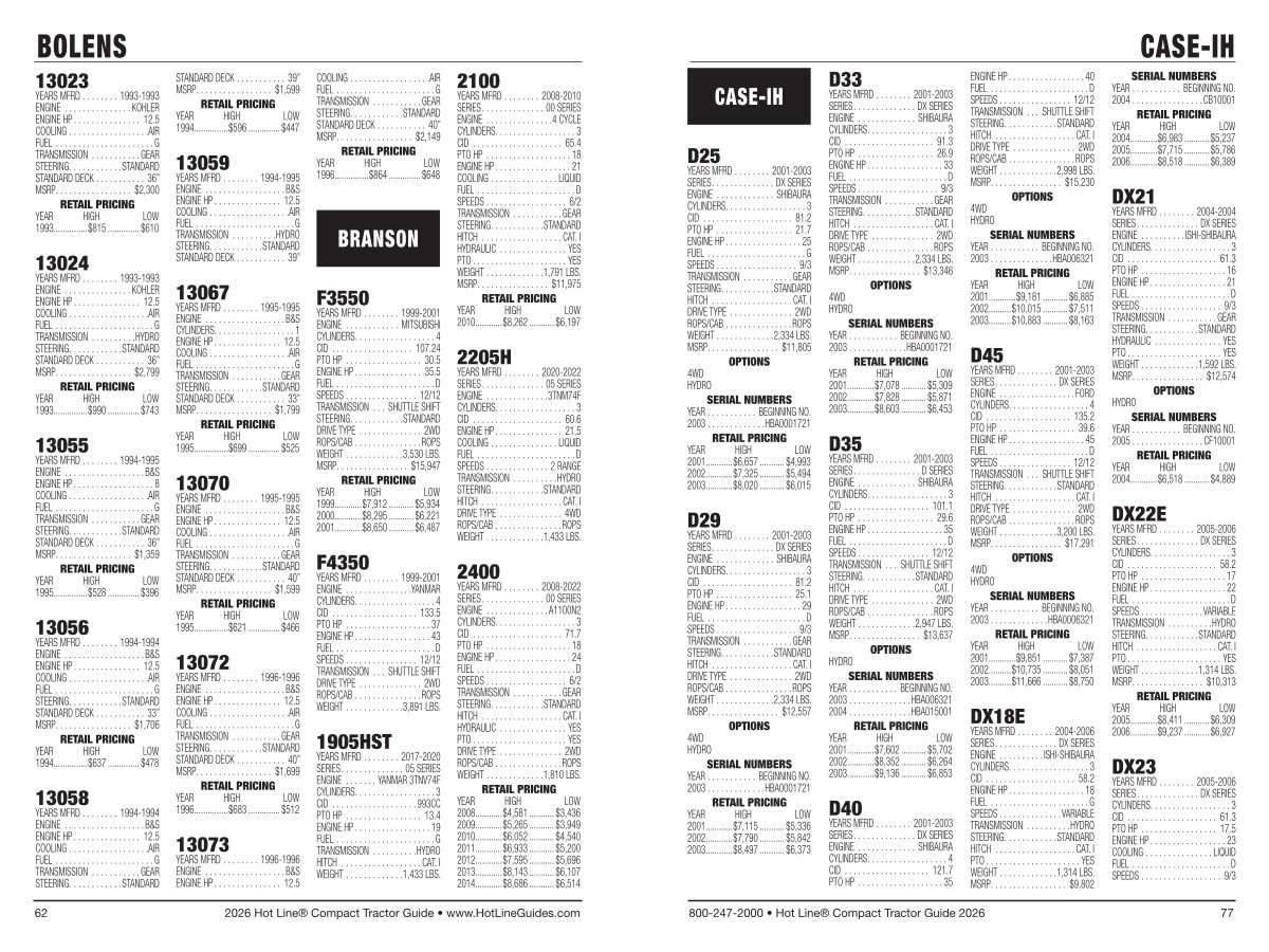 YEARS MFRD........ 2008-2022 SERIES.............. 00 SERIES ENGINE.............. A1100N2 CYLINDERS.................. 3 CID.................... 71.7 PTO HP................... 18 ENGINE HP................. 24 FUEL...................... D SPEEDS.................. 6 / 2 TRANSMISSION........... GEAR STEERING............ STANDARD HITCH.................. CAT. I HYDRAULIC............... YES PTO..................... YES DRIVE TYPE.............. 2WD ROPS / CAB............... ROPS WEIGHT............. 1,810 LBS. RETAIL PRICING YEAR HIGH LOW 2008............$ 4,581............ $ 3,436 2009............$ 5,265............ $ 3,949 2010............$ 6,052............ $ 4,540 2011............$ 6,933............ $ 5,200 2012............$ 7,595............ $ 5,696 2013............$ 8,143............ $ 6,107 2014............$ 8,686............ $ 6,514