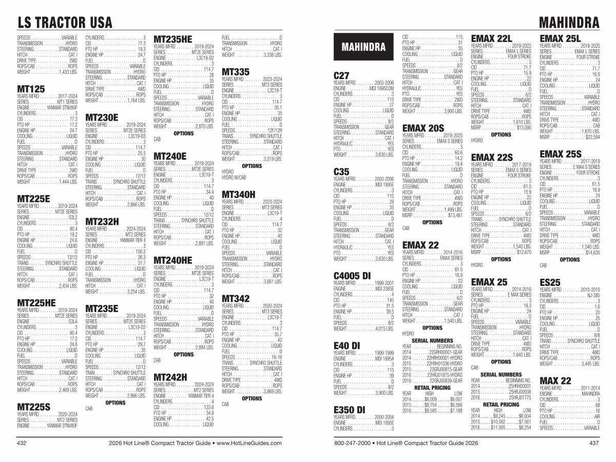 YEARS MFRD........ 2018-2025 SERIES.......... EMAX L SERIES ENGINE.......... FOUR STROKE CYLINDERS.................. 3 CID.................... 71.7 PTO HP................. 16.9 ENGINE HP................. 24 COOLING............... LIQUID FUEL...................... D SPEEDS.............. VARIABLE TRANSMISSION.......... HYDRO STEERING............ STANDARD HITCH.................. CAT. I DRIVE TYPE.............. 4WD ROPS / CAB................ CAB WEIGHT............. 1,870 LBS. MSRP................ $ 22,594