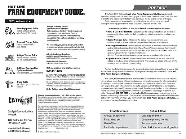 Hot Line ® Guides Division has attempted to assemble the most accurate information available to us. Some of the models are not complete because the information that is missing is not available, or very little is known about some of the models. Dates will vary depending upon who interprets the data. We are aware that some of our readers are experts on their specific equipment or brand. If and when mistakes or omissions are found, we would greatly appreciate the help of our readers’ knowledge to correct our data. Please call 800-247-2000 or email subs @ hotlineguides. com to inform us of any incorrect or missing information. This book will be re-evaluated, updated and will become better with your help. We hope you will mention Hot Line Farm Equipment Guide ® as your source for specifications and pricing.